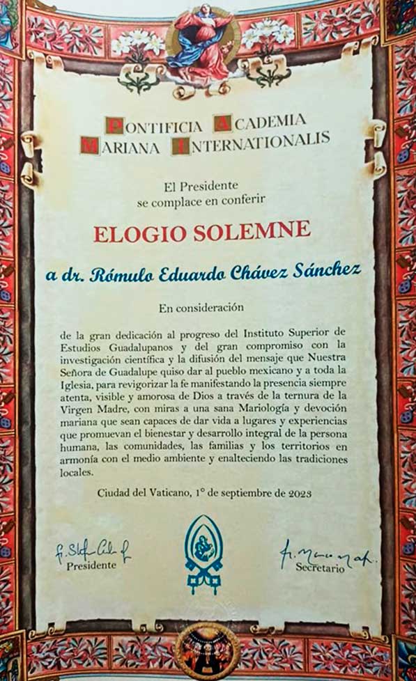 La Pontificia Academia Mariana Internacional (PAMI) otorgó un “elogio solemne” al P. Eduardo Chávez, director del Instituto Superior de Estudios Guadalupanos (ISEG), por su compromiso con la investigación científica y la difusión del mensaje de Nuestra Señora de Guadalupe.