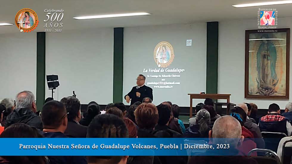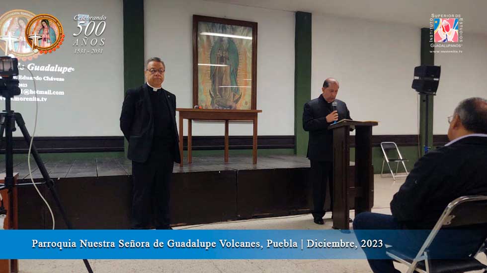 "Una casita sagrada para ensalzarlo a Él que es mi Amor persona" Estas palabras del Nican Mopohua parecen estar vivas en cada iglesia donde es venerada la Virgen de Guadalupe que nos trae a su "Amor-Persona" su Hijo Jesús Señor nuestro. En la Parroquia de Nuestra Señora de Guadalupe (Volcanes) de la ciudad de Puebla no es la excepción pues con grande alegría más de 250 personas asistían a la Conferencia "La Verdad de Guadalupe" con Mons. Eduardo Chávez quien también con mucho entusiasmo comprobaba el amor a Dios y la Virgen de Guadalupe en esta Parroquia. Desde la llegada se percibía un ambiente vivo y alegre por conocer más sobre el mensaje de nuestra madre de Guadalupe.